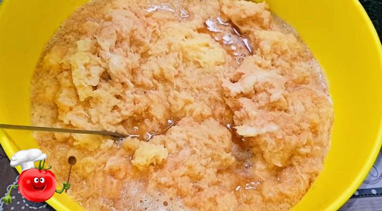 Очищаємо часник та пропускаємо через прес. Додаємо його, засмажку, манну крупу та молоко до картоплі. Солимо і перчимо. Добре перемішуємо всі інгредієнти.