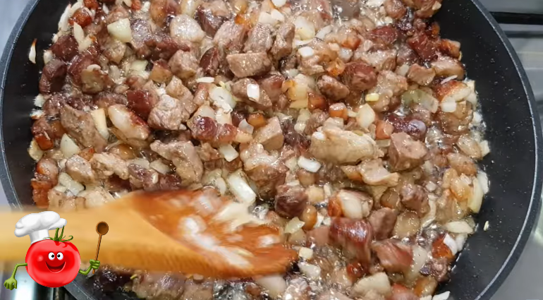 Очищаємо цибулю. Дрібно його нарізаємо. Додаємо цибулю до сала та м’яса. Обсмажуємо до золотистості.