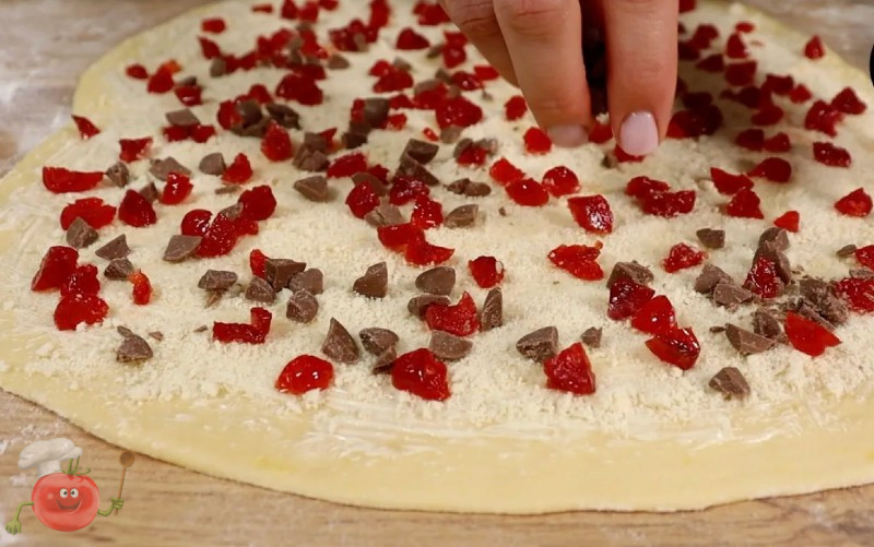 Змащую його м’яким вершковим маслом, посипаю мигдальним борошном, рівномірно розкладаю вишню та шматочки шоколаду.