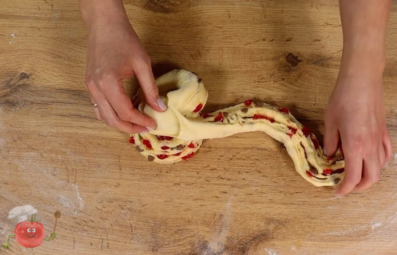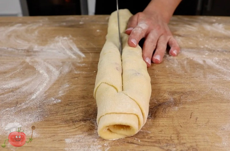 Скручую тісто у щільний рулет і защипую край. Потім гострим ножем розрізаю рулет уздовж майже до кінця, залишивши приблизно 2–3 см зверху нерозрізаними.