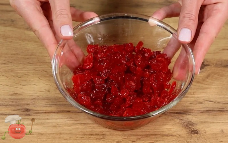 В’ялену вишню дрібно нарізаю, заливаю коньяком і залишаю приблизно на 1 годину, щоб вона добре просочилася.