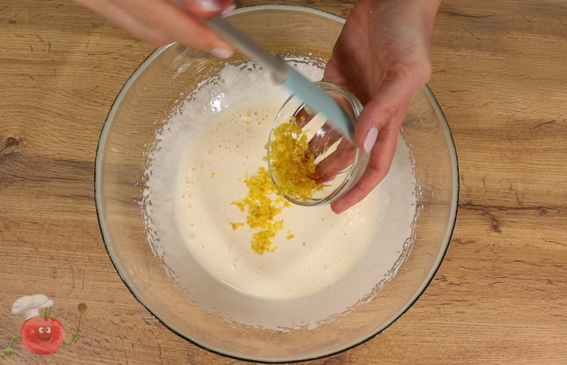 У глибоку миску розбиваю яйця, додаю цукор, сіль і ванілін. Збиваю міксером 4–5 хвилин, поки маса не стане світлою та пишною. Додаю лимонну цедру і обережно перемішую. Коли опара підніметься, додаю її до яєчної маси та перемішую до однорідності.