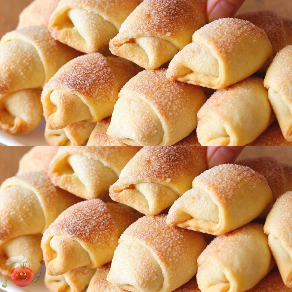Викладаємо по одній чайній ложці вареного згущеного молока. Формуємо печиво так: краї підгинаємо до центру, закриваємо начинку і далі згортаємо, як звичайний рогалик. Рогалики обмочуємо однією стороною в цукор і викладаємо на лист застелений папером для випічки.