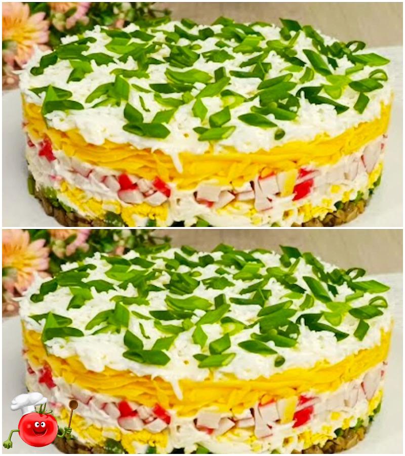 Салат з крабовими паличками й грибами — ніжний святковий салат з печерицями, яйцями та сиром. Смачний салат-тортик на Новий рік, Різдво, День народження. Швидкий рецепт — готується легко й виглядає дуже апетитно!  Соковиті гриби з цибулькою, ніжні яйця, крабові палички й вершковий сир створюють ідеальне поєднання смаків. Готується легко та без зайвих зусиль — стане справжньою зіркою на вашому святковому столі ✨