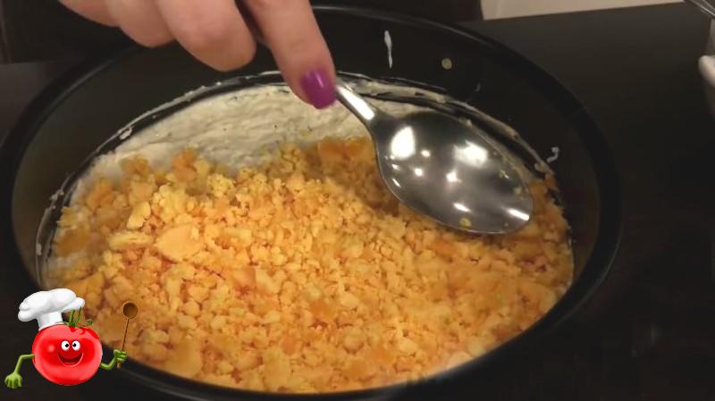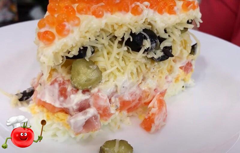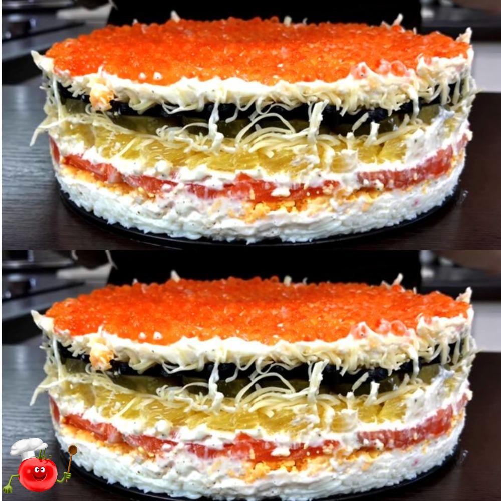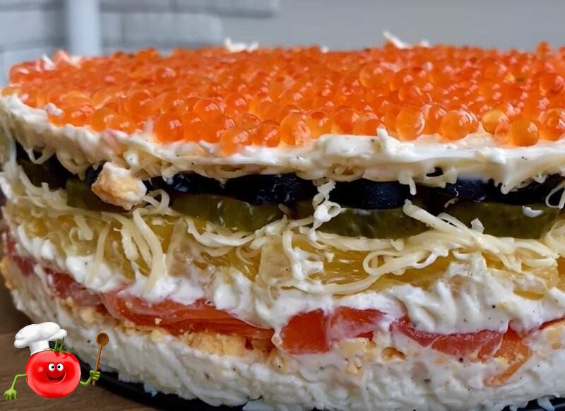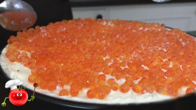 ✅Прибираємо форму в холодильник на 3 – 4 години для просочення, накривши плівкою. Перед подачею до столу, засипаємо поверхню салату червоною ікрою. За бажанням додатково прикрашаємо зеленню.