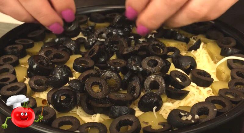 ✅На сир укладаємо нарізані огірки і маслини. Тепер решту сиру. Заливаємо салат соусом.