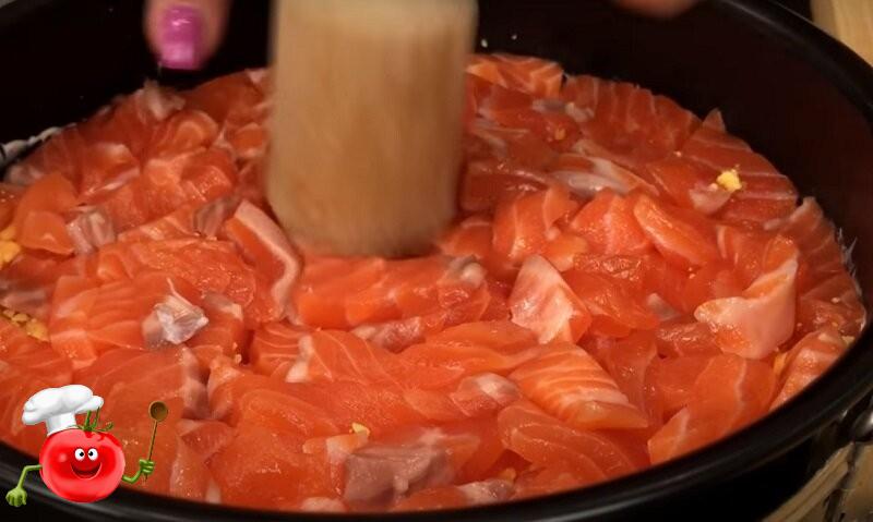 ✅ Другим шаром укладаємо жовтки, також змащуємо їх соусом. Тепер скибочки риби. Їх укладаємо щільно, після чого притискаємо ложкою або товкачем, щоб ущільнити шари салату, інакше в подальшому він втратить форму.