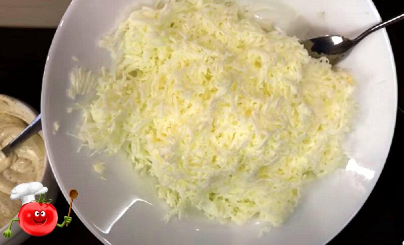 ✅Салат збираємо на блюді, шарами, через сервірувальне кільце або через бортик роз’ємної форми для випічки. Першим шаром будуть білки. Їх укладаємо вниз форми, розрівнюємо. Змащуємо майонезом, змішаним з меленим перцем. При бажанні можна додати в майонез і ложку солодкої гірчиці.
