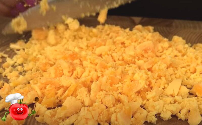 ✅Білки натираємо на тертці, а жовтки подрібнюємо ножем. Натираємо на дрібній тертці сир. Готову рибу нарізаємо тонкими скибочками.