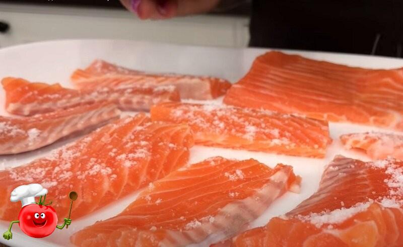 ✅Почнемо з риби. По суті, замість форелі можна взяти будь-яку червону рибу в свіжому або слабосоленому вигляді. Якщо риба свіжа, нарізаємо її вздовж скибочками товщиною близько 1 см, розкладаємо на тарілці і просто посипаємо сіллю, цукром (буквально 2 – 3 щіпки), меленим перцем. Накриваємо плівкою і прибираємо в холодильник на 2 години.