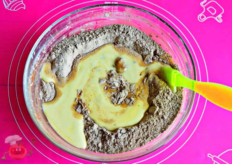 Почнеться реакція, маса збільшиться в об’ємі, стане пишною і посвітлішає. Тепер у неї, поки вона гаряча, потрібно додати какао і ще раз активно перемішати. Маса повинна стати однорідною і буде приголомшливо пахнути шоколадом! Дати масі охолонути, а потім частинами додати борошно. Під час додавання борошна маса не повинна бути гарячою.