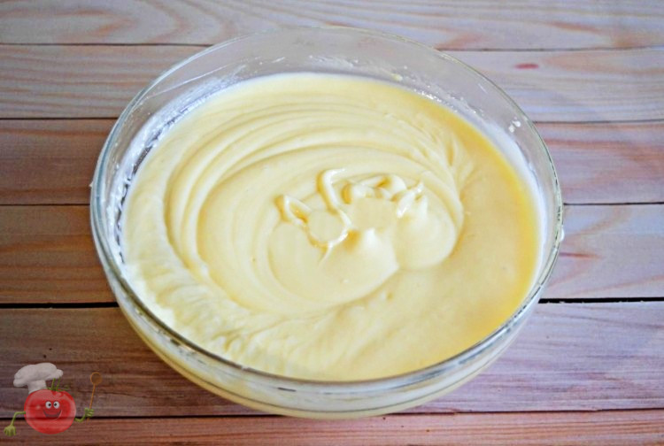 Спочатку лопаткою, потім міксером на низькій швидкості. Як тільки крем з’єднався і став однорідним, він готовий! Поставити його в холодильник на пару годин перед складанням торта, щоб з ним було зручніше працювати. Якщо торт відразу збирати в кільці, то крем можна не охолоджувати. Крем виходить дуже смачним!