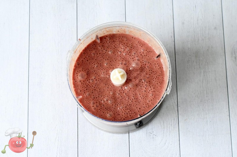 У чаші блендера з’єднайте печінку, яйця, 75 мл розтопленого вершкового масла, вершки, коньяк, чорний мелений перець і сіль. Все збийте до отримання однорідної маси. Можете додатково процідити масу через сито. Якщо немає блендера, можете пропустити все через м’ясорубку і потім змішати з іншими інгредієнтами.