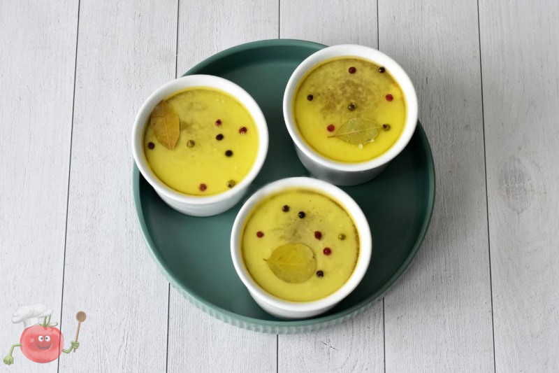Паштет охолодіть при кімнатній температурі і залийте зверху розтопленим вершковим маслом, що залишилося. Зверху посипте горошинами перцю, додайте по 1 лавровому листу. Поставте паштет в холодильник до застигання масла.