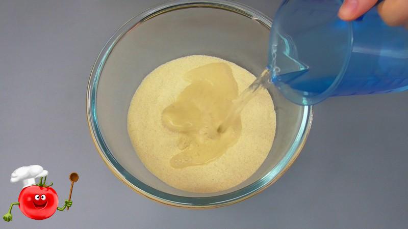 ✅Манку всипаємо в чашу, зручну для замішування дріжджового тіста. Додаємо сухі дріжджі, цукор, все перемішуємо. Якщо використовуєте свіжі дріжджі, то їх треба розвести в теплій воді, відливши невелику кількість від загальної порції.