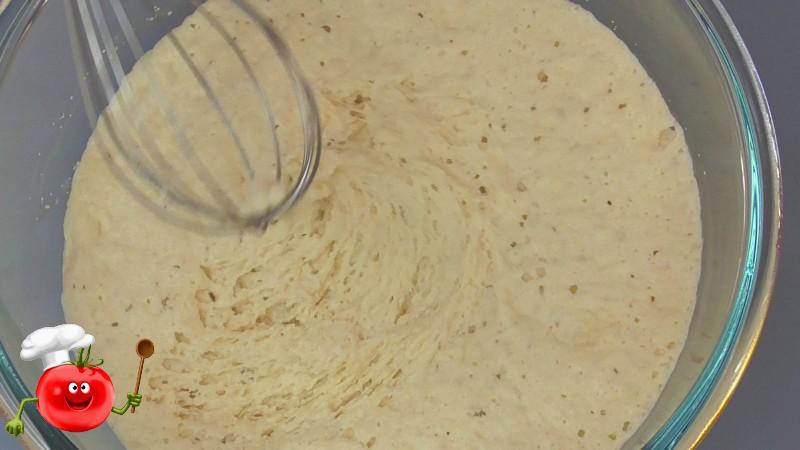 ✅Через годину молоко нагріваємо приблизно до 50 градусів і додаємо його до вже набряклого тіста, перемішуємо.