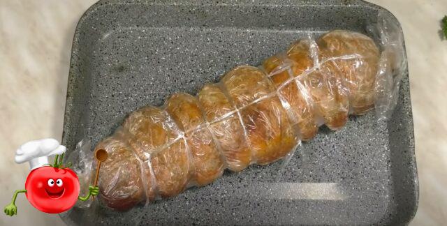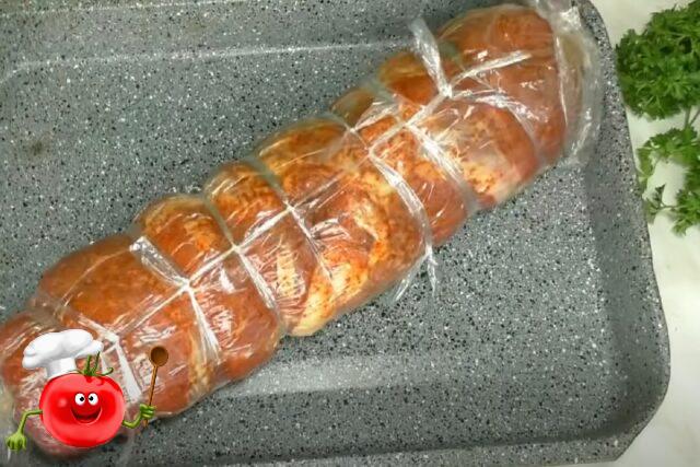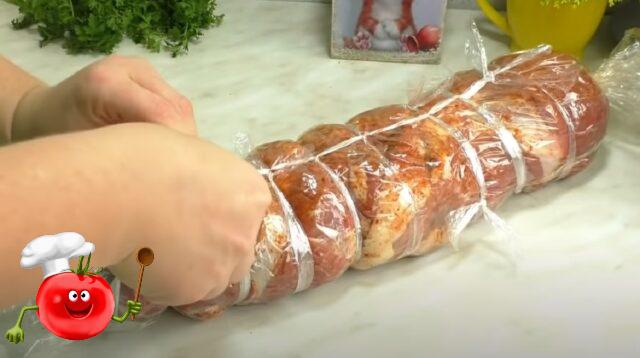 Покладіть м’ясний рулет у харчовий пакет для запікання. Зв’яжіть його харчовою ниткою або смужками тієї ж плівки, щоб він мав гарну форму і не розпався під час приготування.