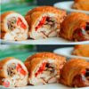 На кожен млинець викладаю скибочку жовтого сиру, скибочку шинки, дві столові ложки обсмажених печериць, кілька скибочок кабачків і по два шматочки червоного та жовтого перцю.